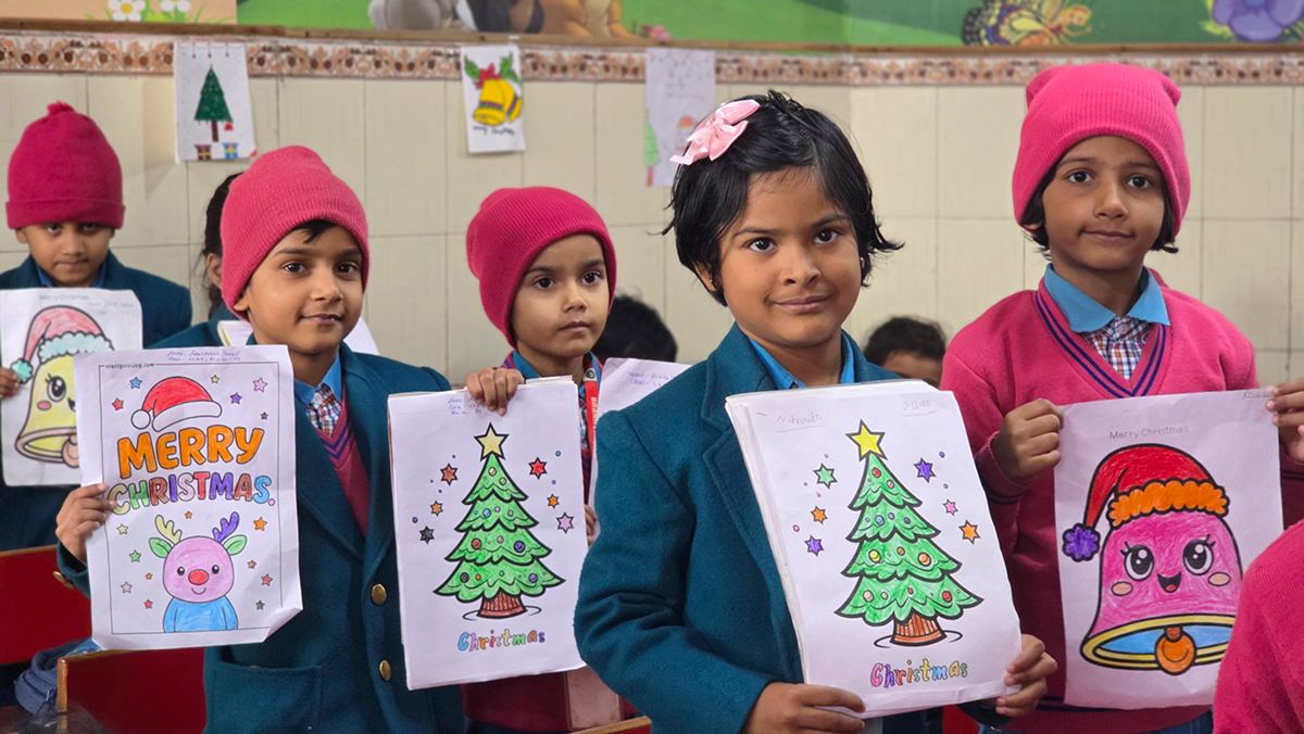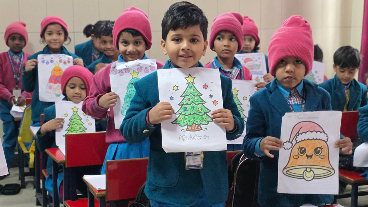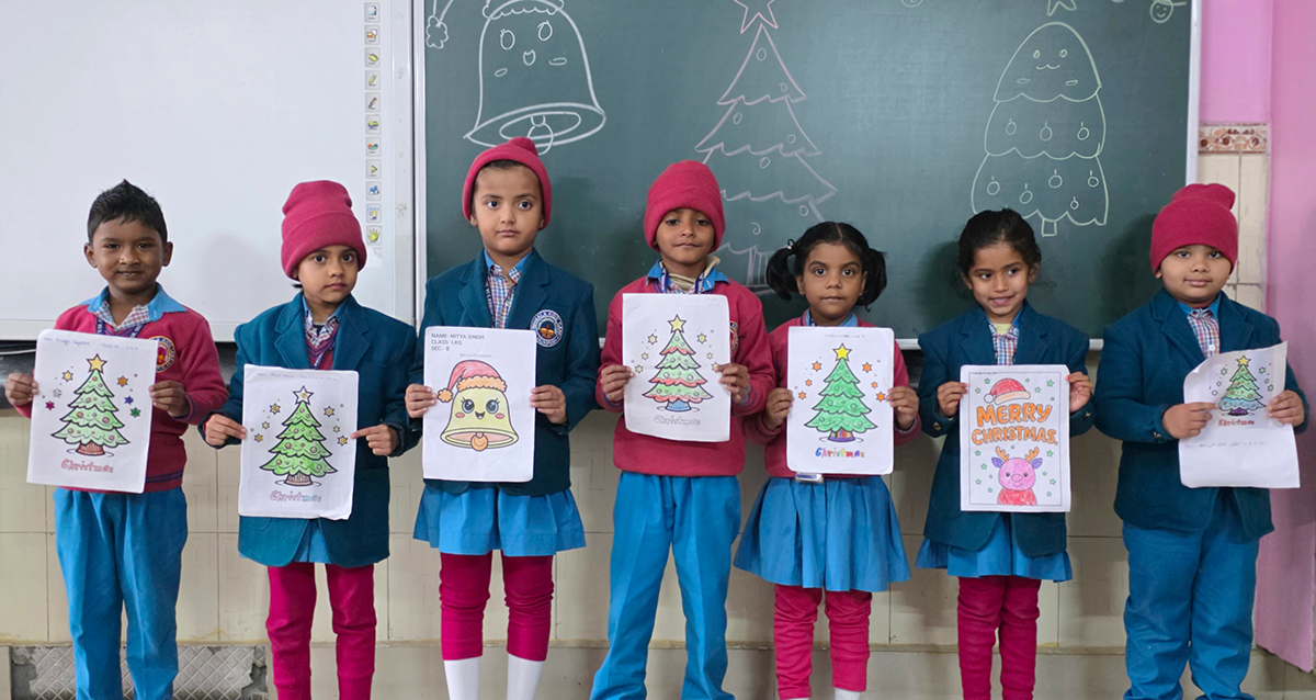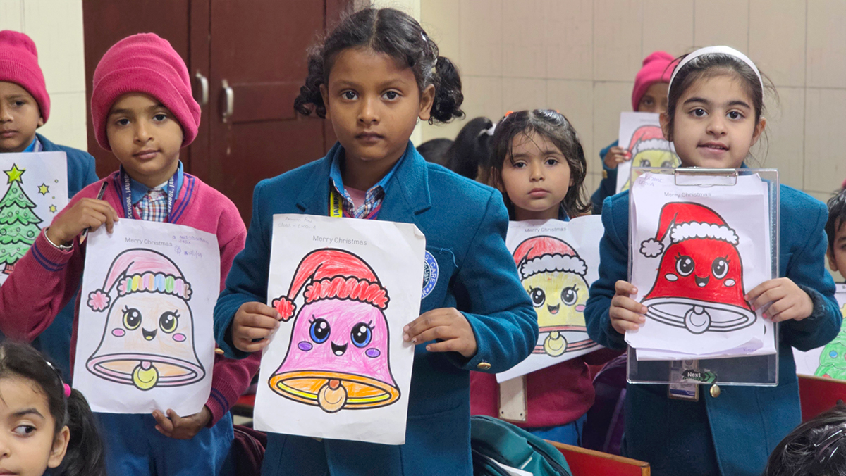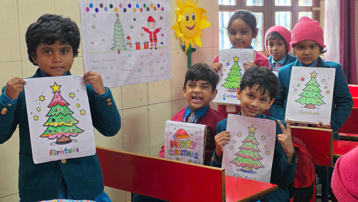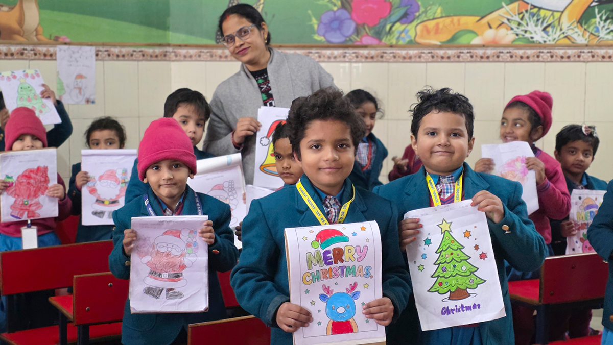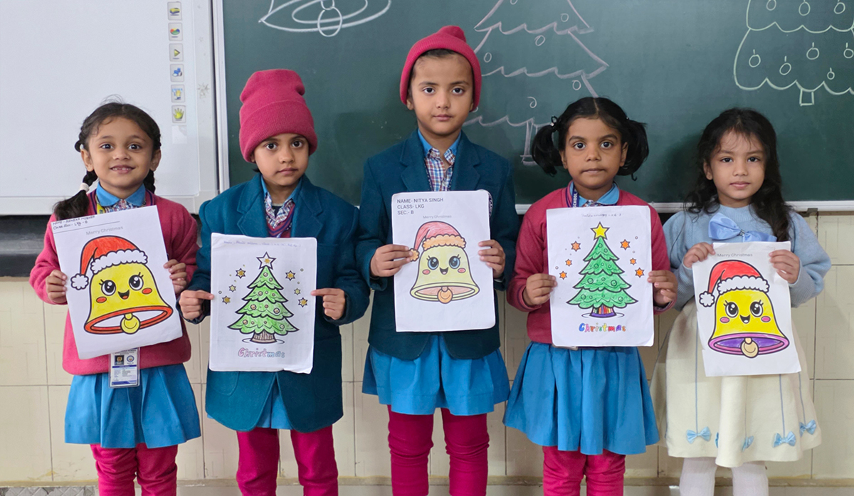 A drawing and coloring activity on the Christmas theme was conducted for KG students, where children happily drew and colored pictures of Christmas trees, Santa Claus, stars, and bells. The activity encouraged creativity, improved fine motor skills, and helped students express their joy of the Christmas season in a fun and engaging way.