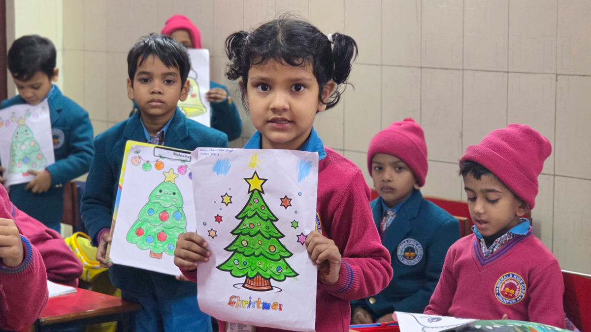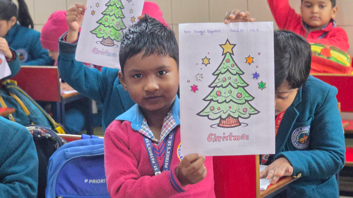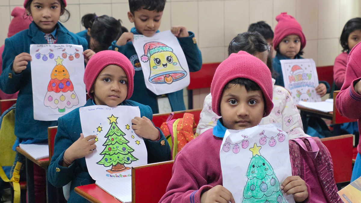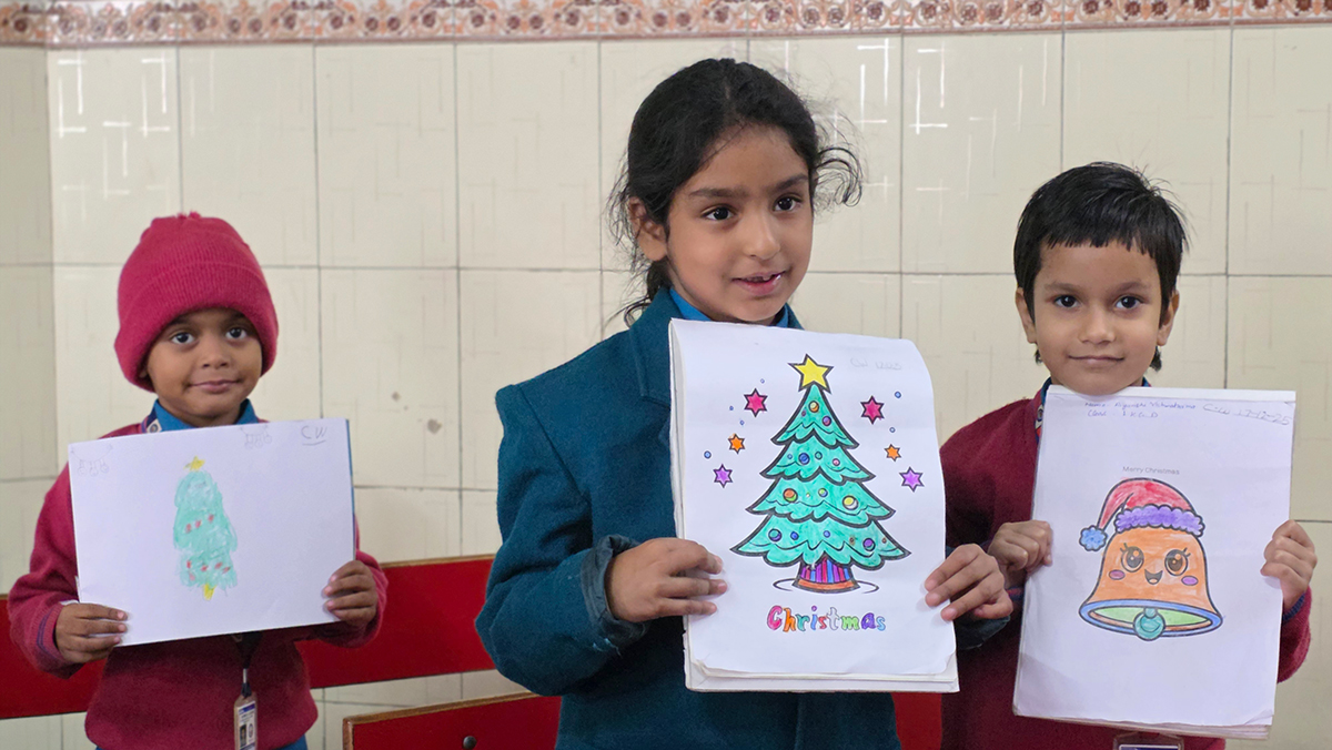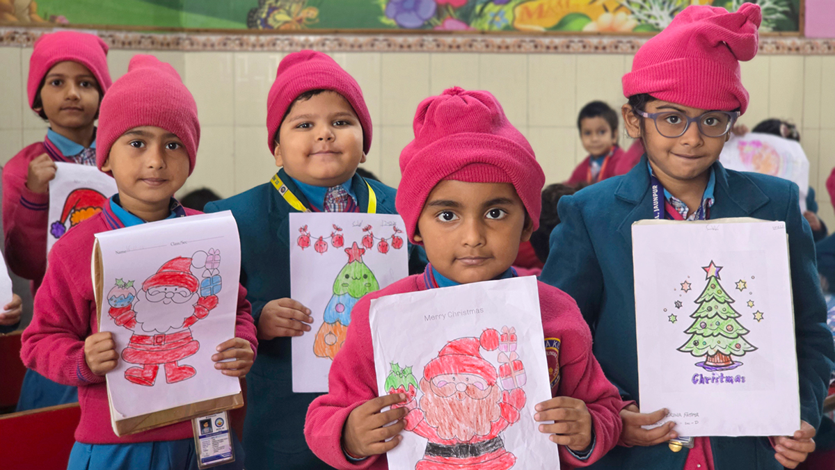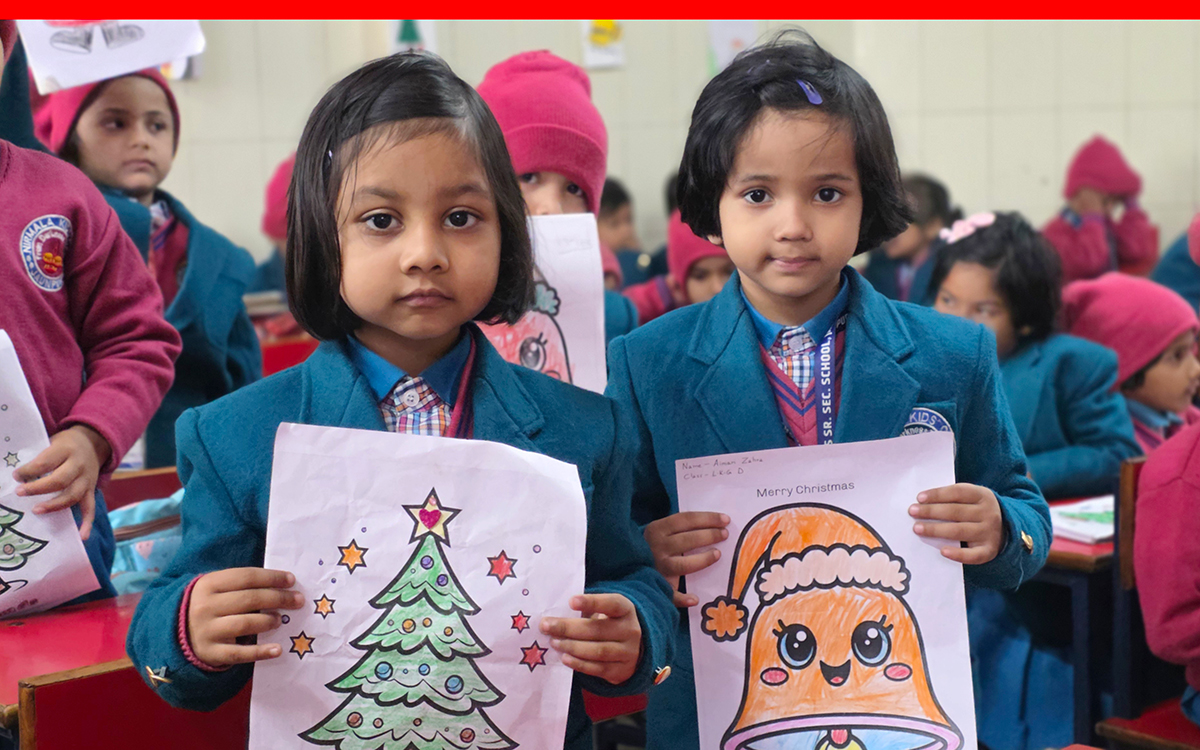 A drawing and coloring activity on the Christmas theme was conducted for KG students, where children happily drew and colored pictures of Christmas trees, Santa Claus, stars, and bells. The activity encouraged creativity, improved fine motor skills, and helped students express their joy of the Christmas season in a fun and engaging way.