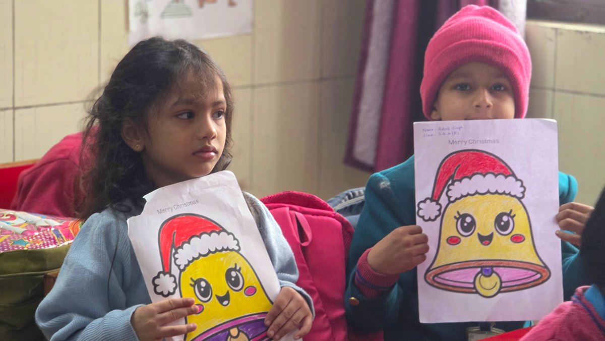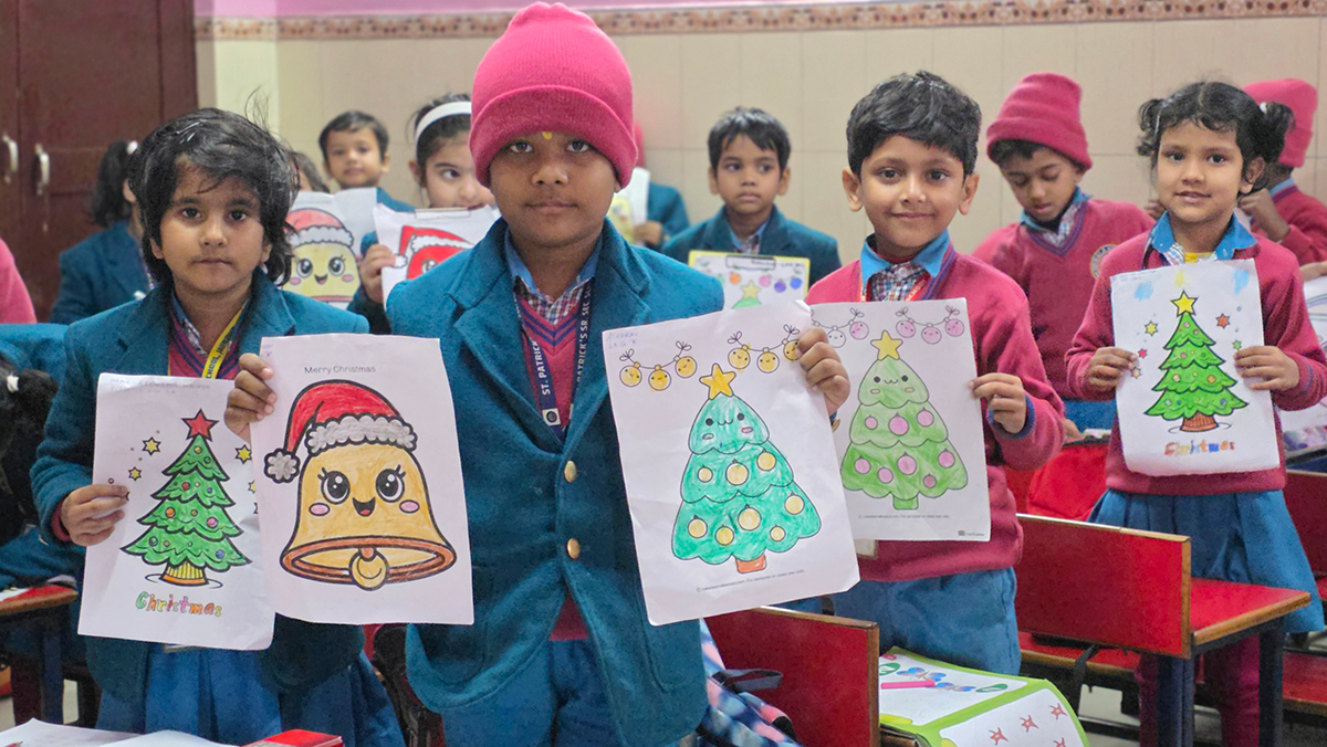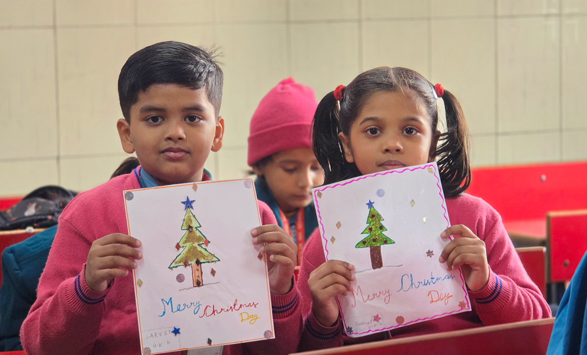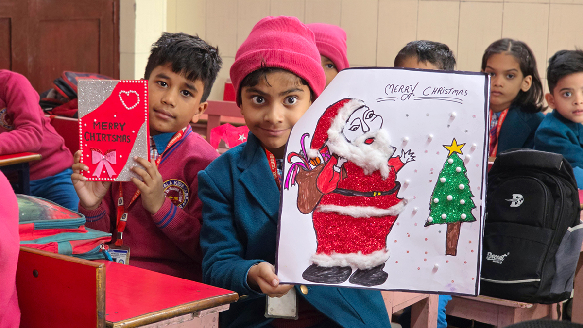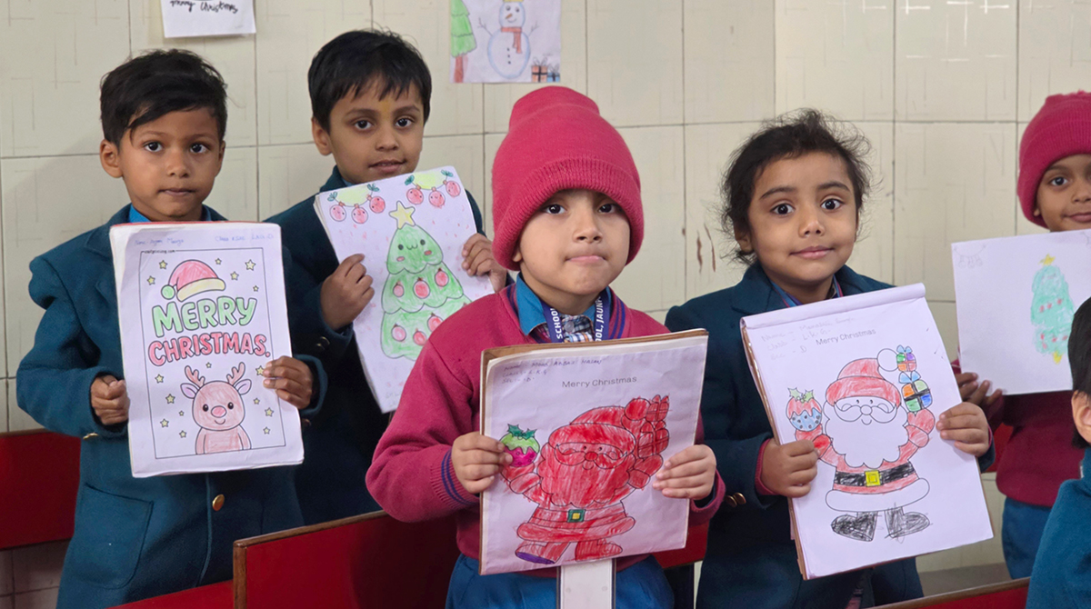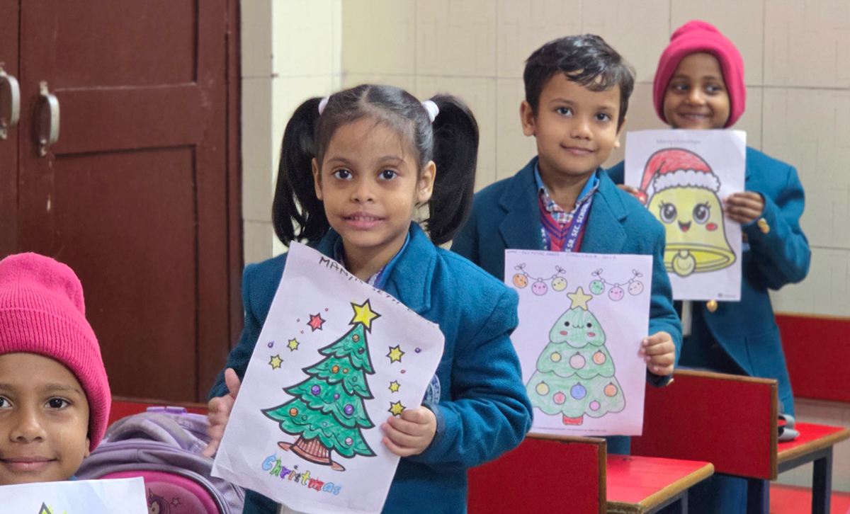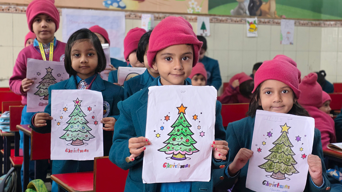 A drawing and coloring activity on the Christmas theme was conducted for KG students, where children happily drew and colored pictures of Christmas trees, Santa Claus, stars, and bells. The activity encouraged creativity, improved fine motor skills, and helped students express their joy of the Christmas season in a fun and engaging way.
